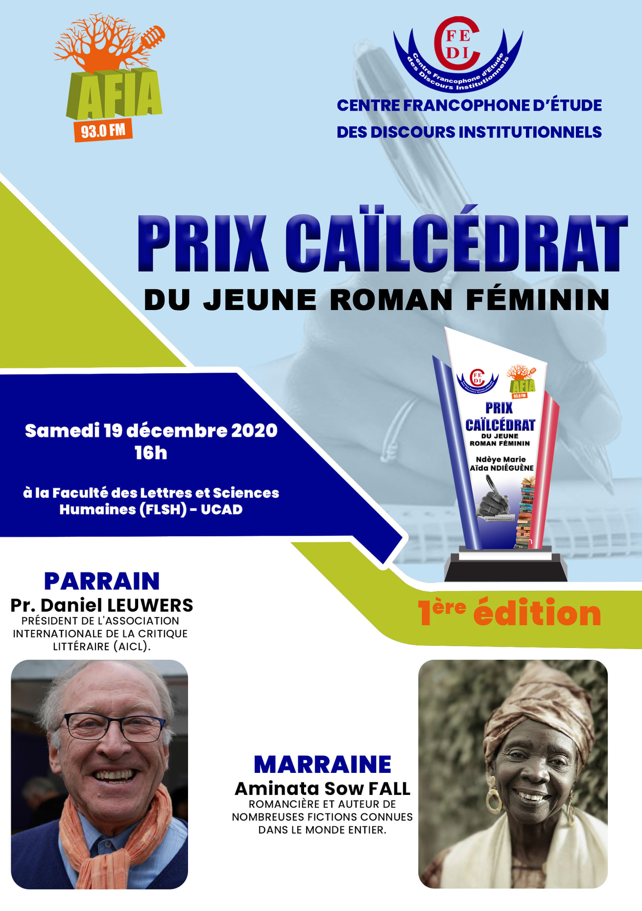 Ndèye Marie Aïda Ndiéguène réussit bien son entrée dans la communauté des créateurs et dans le monde lettré. C’est pourquoi nous lui décernons solennellement le Prix Caïlcédrat du Jeune roman féminin.