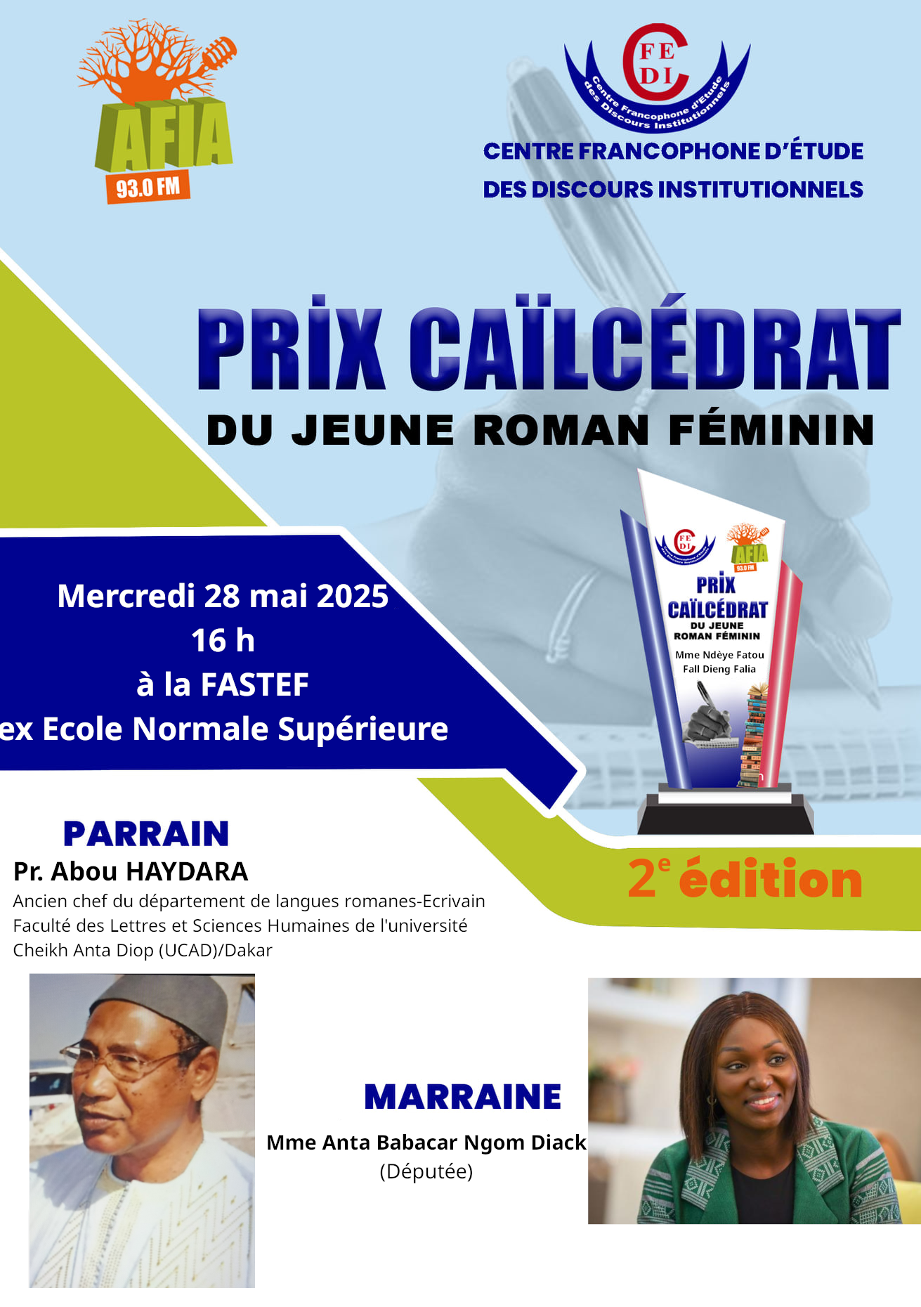Makhtar Diop est précisément un représentant de cette nouvelle aspiration, de cette nouvelle pulsion créative. Il se révèle un poète lyrique, de grande sensibilité, qui a donné une œuvre significative connue bien au-delà de nos frontières nationales, comme celle de sa consœur la romancière Ndèye Marie Aïda Ndiéguène, par le biais de la revue Les eaux vives, une création de l'association Internationale de la Critique Littéraire (AICL), dont le siège est à Tours, en France. Falia, vous porterez, symboliquement s'entend, sous le grand caïlcédrat, le diadème de la dignité littéraire, tandis que Makhtar ceindra son front de la couronne de Guiera senegalensis du mérite, seule  condition pour accéder, au statut d’impétrant du prochain Prix Caïlcédrat homme, dont le nom reste à déterminer. Il laisse, bien sûr, la porte entrouverte, pour tout autre prétendant sérieux à la reconnaissance littéraire.